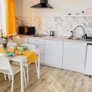 Na dole znajduje się salon( kanapa nie rozkładana) z kuchnią ( sztućce, talerze, kubki, kieliszki, garnki, płyta 2 palnikowa indukcyjna, czajnik bezprzewodowy), lodówka,mikrofalówka tv oraz łazienka z pełnym węzłem sanitarnym oraz suszarka na ubrania.