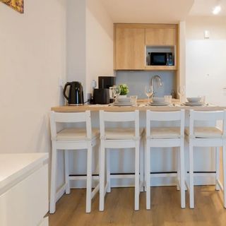 W apartamencie znajduje się aneks kuchenny przystosowany do zaspokajania codziennych potrzeb. Do dyspozycji Gości są sprzęty AGD m.in. lodówka, płyta elektryczna z okapem oraz komplet naczyń, sztućce, akcesoria kuchenne, szklanki i kieliszki do wina. Wszystko, co potrzebne by samodzielnie przygotować posiłki i cieszyć się wspólnymi chwilami z bliskimi.