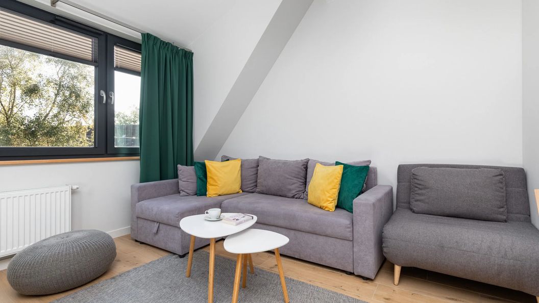 Na przytulną przestrzeń składa się salon z aneksem kuchennym, sypialnia oraz łazienka z prysznicem. Apartament wyróżnia się domowym wystrojem, nowoczesną estetyką i wysoką funkcjonalnością. Część mieszkalna, wyposażona w wygodną sofę i telewizor to idealne miejsce do odpoczynku i relaksu. Aneks kuchenny wyposażony jest w wysokiej jakości sprzęt AGD, który pozwala na przygotowanie ulubionych posiłków. Jest tu płyta indukcyjna, mikrofalówka, zmywarka, a nawet ekspres do kawy! Unikalny wystrój i kompleksowe wyposażenie w niezbędne akcesoria łazienkowe (suszarka do włosów, pralka) gwarantują komfortowy pobyt. Rodzice podróżujący z dzieckiem mogą również za dodatkową opłatą zarezerwować łóżeczko dla swojej pociechy. Dla ułatwienia rozpoczęcia każdego pobytu zapewniony jest bezpłatny zestaw kosmetyków, ręczniki oraz pościel.