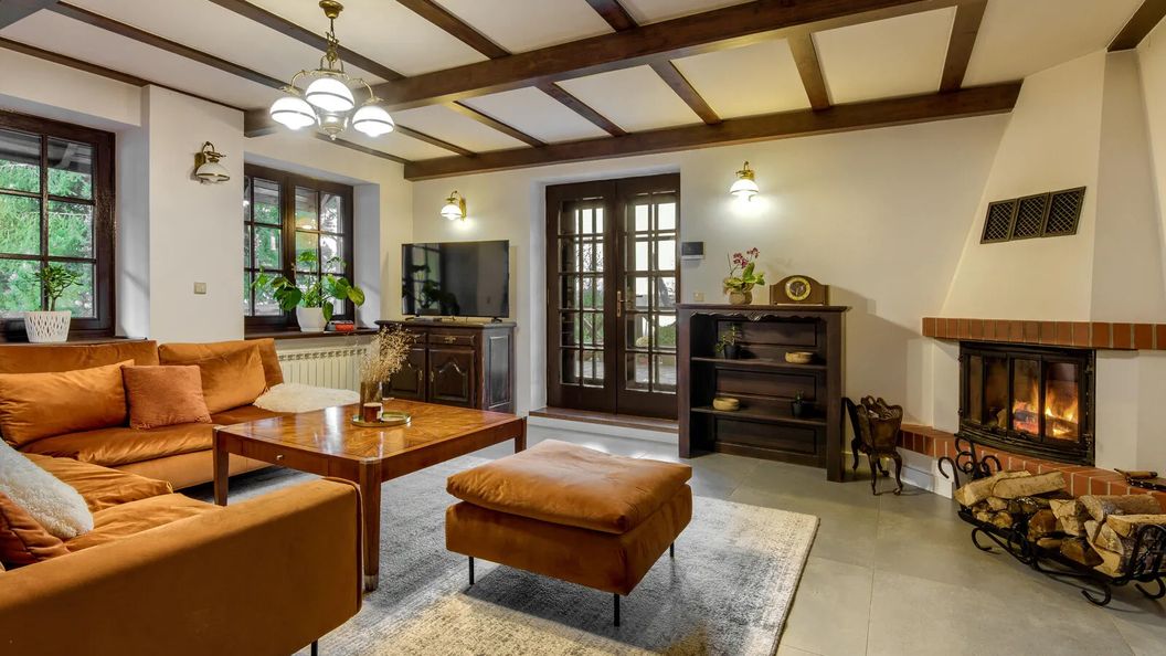 duży salon z kominkiem i wyjściem na taras