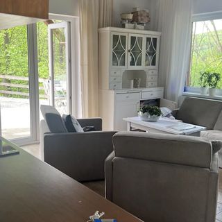 Domek został zmodernizowany w 2024 roku. Wszystko z technicznych rzeczy jest nowe. Ogrzewanie gazowe z ciepłą wodą plus ogrzewanie podłogowe elektryczne plus kominek na drewno. Na 50 m2 parterze jest salon z dużym aneksem kuchennym, stół, meble wypoczynkowe. Sypialna z podwójnym łóżkiem, szafą, fotelem. Łazienka z prysznicem. Na antresoli pokoik 25m2 z dwoma pojedynczymi łóżkami. Wspólnie z sąsiadami można korzystać w ogrodzie z paleniska na ognisko, hamaków, pomieszczenia na rowery, narty, sanki, sprzęt sportowy, wózki. Istnieje możliwość korzystania z węża ogrodowego, aneksu letniego.