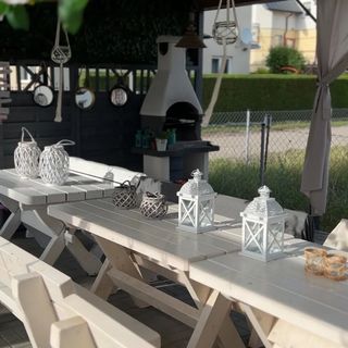 - Przestronną wiatę z girlandą świetlną i dużą ilością przestrzeni do spędzania wolnego czasu, w której do dyspozycji gości są dwa grille.