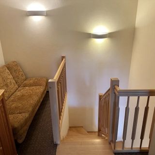 Na piętrze znajdują się dwie sypialnie, w jednej jest łazienka. U góry jest także rozkładana sofa.