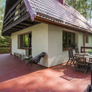 - Dom wykonany z drewna i cegły