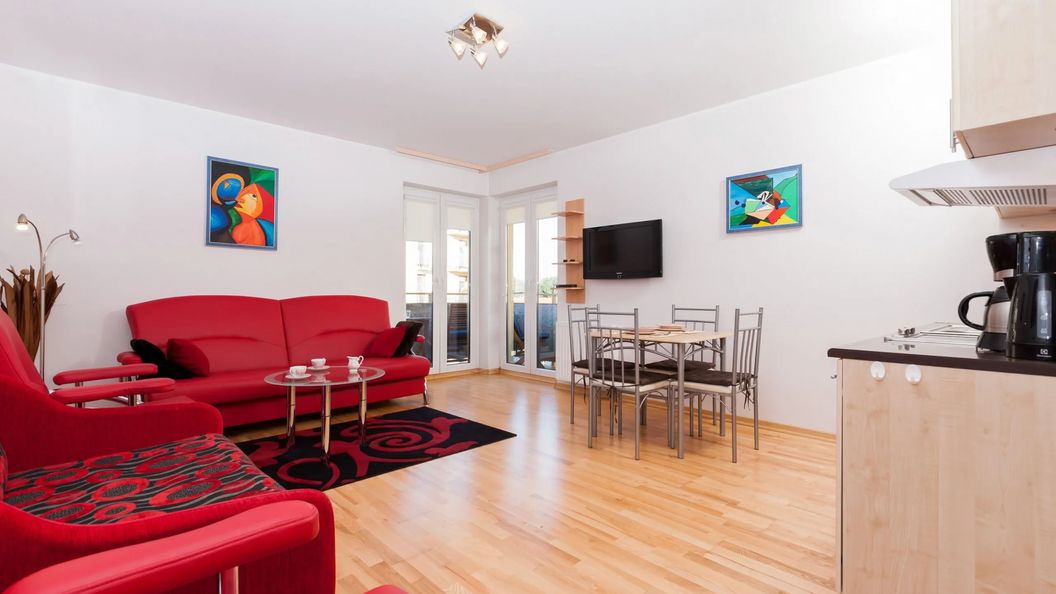 W pełni wyposażony apartament z możliwością zakwaterowania 4 osób (3 osoby dorosłe + dzieci) składa się z części sypialnianej z podwójną oraz pojedynczą rozkładaną sofą. W pełni wyposażony aneks kuchenny oraz prywatna łazienka z prysznicem pozwoli gościom poczuć się tu jak w domu. Także dostęp do szybkiego bezprzewodowego Internetu oraz telewizor z płaskim ekranem uprzyjemnią pobyt w apartamencie. Do dyspozycji gości znajduję się również balkon ze stolikiem oraz krzesłami. Podróżujący z dziećmi rodzice znajdą w wyposażeniu apartamentu również łóżeczko oraz krzesełko dla swojej pociechy (konieczna wcześniejsza rezerwacja).