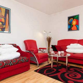Dwie rozkładane sofy, pościel, 2 fotele, przesuwna szafa z lustrem, stolik do kawy, sprzęt RTV i AGD, centralne ogrzewanie, wyjście na balkon wyposażony w stolik oraz dwa krzesła