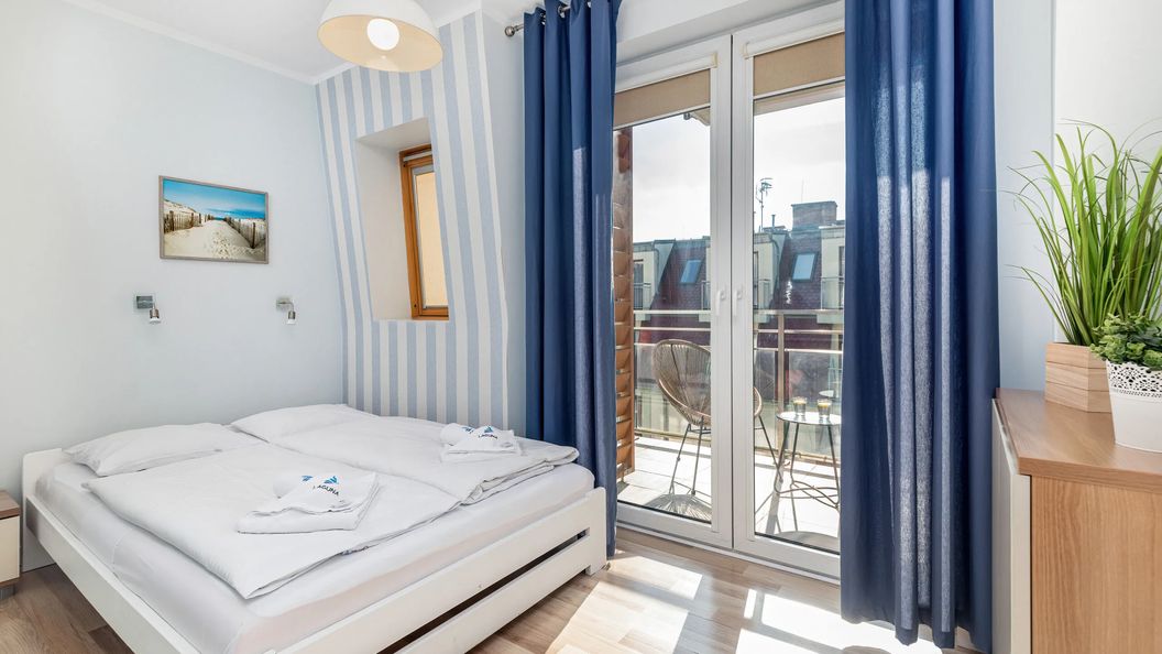 W apartamencie może mieszkać do 5 osób (4 osoby dorosłe + dzieci). Mieszkanie składa się z pokoju dziennego z aneksem kuchennym, sypialni oraz łazienki. Przestronny balkon zapewnia dodatkową przestrzeń do relaksu. Układ spania obejmuje podwójne łóżko w sypialni oraz dwuosobową rozkładaną sofę w pokoju dziennym. Na życzenie rodziców podróżujących z małymi dziećmi apartament może zostać wyposażony w łóżeczko i krzesełko do karmienia. Miejsce urządzone jest w eleganckich kremowych odcieniach przeplatanych elementami brązu. Prawdziwym atutem tego wakacyjnego lokum jest jego funkcjonalność i dostosowanie do potrzeb gości. Kompleksowe wyposażenie kuchni obejmuje płytę indukcyjną, kuchenkę mikrofalową, ekspres do kawy oraz toster. Udogodnienia multimedialne to bezpłatna sieć Wi-Fi oraz telewizja kablowa z dostępem do kanałów niemieckich i polskich. Na dobry początek pobytu dla gości przewidziany jest pakiet powitalny z zestawem kosmetyków, ręcznikami i pościelą.