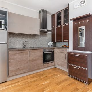Stół z 4 krzesłami, czajnik, ekspres do kawy, toster, kuchenka mikrofalowa, płyta kuchenna elektryczna, piekarnik, umywalka, lodówka z zamrażarką, szklanki, zestaw garnków, sztućców, patelnia