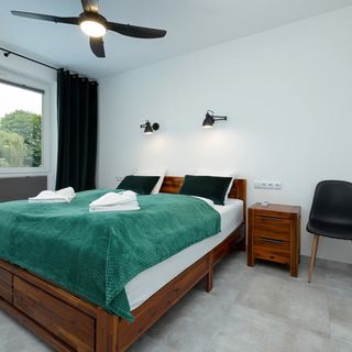 Łóżko podwójne typu King, pościel, szafa, wiatrak sufitowy