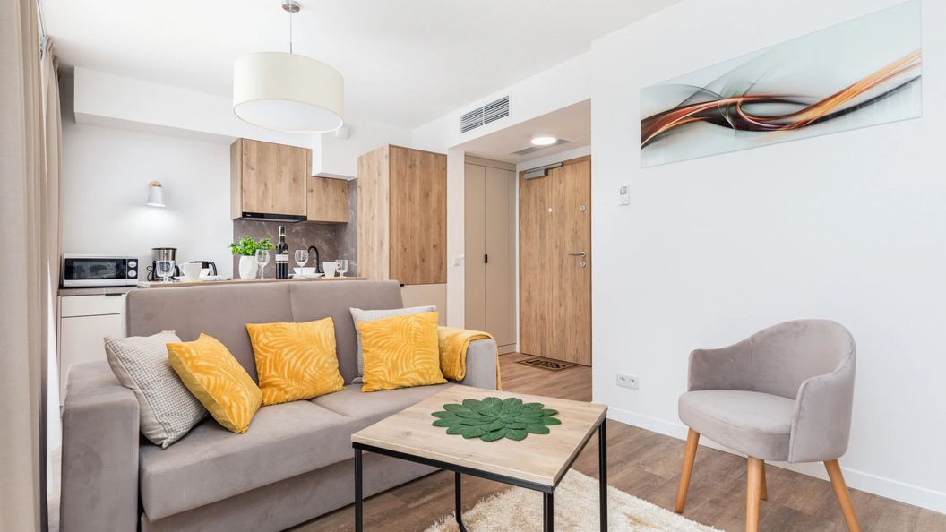 Nowoczesny i klimatyzowany apartament znajduje się na 1 piętrze i ma możliwość zakwaterowania 2 osób. Przestrzeń apartamentu oferuje salon z aneksem kuchennym, balkon oraz łazienkę z prysznicem. Balkon z meblami ogrodowymi, będzie świetnym miejscem na relaks. Apartament wyróżnia się nowoczesnym wystrojem, estetyką oraz funkcjonalnością. Część dzienna wyposażona w rozkładaną sofę i TV stanowi doskonałe miejsce odpoczynku i relaksu, dodatkowo w pełni wyposażony aneks kuchenny umożliwia przyrządzenie ulubionych posiłków. Przyjemny design oraz kompleksowe wyposażenie w niezbędne akcesoria kuchenne oraz łazienkowe gwarantują komfort pobytu.