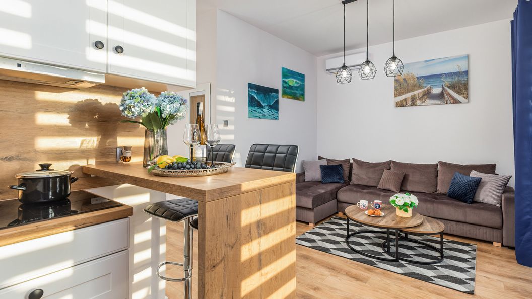Przestrzeń apartamentu oferuje salon z aneksem kuchennym, sypialnię oraz łazienkę z prysznicem. Część mieszkalna oferująca wygodną sofę i TV z dostępem do Netflix stanowi doskonałe miejsce odpoczynku i relaksu. Taras wyposażony w meble ogrodowe będzie idealny na odpoczynek w ciepłe, letnie wieczory. Dodatkowo, wyposażony w wysokiej jakości sprzęt, aneks kuchenny umożliwia przyrządzenie ulubionych posiłków. Ekskluzywny design oraz kompleksowe wyposażenie w niezbędne akcesoria kuchenne oraz łazienkowe gwarantują komfort pobytu.