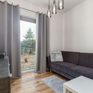Sofa rozkładana, stolik kawowy, wyjście na taras