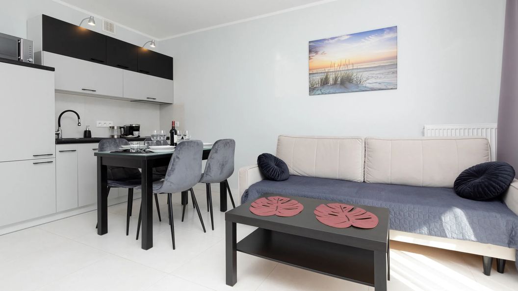Przestrzeń apartamentu oferuje salon z aneksem kuchennym, sypialnie oraz łazienkę z prysznicem. Przestronny balkon z meblami ogrodowymi, będzie świetnym miejscem na relaks. Apartament wyróżnia się nowoczesnym wystrojem, estetyką oraz funkcjonalnością. Część dzienna wyposażona w rozkładaną sofę i TV stanowi doskonałe miejsce odpoczynku i relaksu, dodatkowo w pełni wyposażony aneks kuchenny umożliwia przyrządzenie ulubionych posiłków. Przyjemny design oraz kompleksowe wyposażenie w niezbędne akcesoria kuchenne oraz łazienkowe gwarantują komfort pobytu. Apartament posiada także przytulną sypialnię z wygodnym łóżkiem.