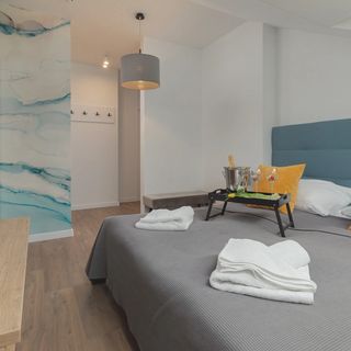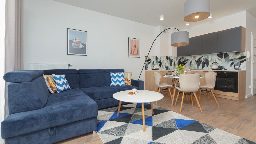 Ten przestronny apartament jest w stanie pomieścić aż cztery osoby, dzięki czemu jest idealnym rozwiązaniem zarówno dla osób podróżujących samotnie, jak i dla tych, którzy szukają apartamentu w parze czy w grupie. Wnętrze zostało w całości zaprojektowane przez Alicję Wolsztyn, projektankę wnętrz z firmy KLass Design z Koszalina. Apartament składa się z dużego salonu z aneksem kuchennym, osobnej sypialni z garderobą i dużym łóżkiem małżeńskim, slonecznego balkonu, a także łazienki z prysznicem. Całość pomieszczeń urządzona została w biało- niebieskich barwach, dzięki czemu wnętrze zachowuje nadmorski klimat. Apartament charakteryzuje się niezwykłą funkcjonalnością, dzięki zastosowanym w nim rozwiązaniom. Przynależąca do sypialni garderoba zapewnia niesamowity komfort pobytu. Dzięki lokalizacji balkonu goście mogą cieszyć się słońcem, bez względu na porę roku. Dodatkowo balkon został wyposażony w wygodne meble ogrodowe, co sprawia że jest to idealne miejsce na wieczorny relaks. Wysoki standard i komfort pobytu zapewnia wiele udogodnień, m. in. telewizja ze smartTV, bezpłatne łącze internetowe Wi-Fi oraz bogate wyposażenie kuchenne i łazienkowe. Goście podróżujący z małym dzieckiem znajdą w apartamencie również łóżeczko i krzesełko dla swojej pociechy.
