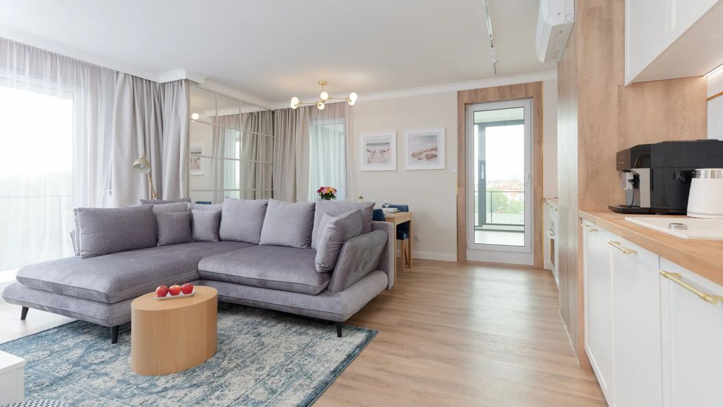 Starannie zaprojektowane wnętrze apartamentu jest odpowiednie na pobyt dla 8 osób, dzięki czemu jest to idealna propozycja dla osób podróżujących w większych grupach czy dużych rodzin. Przestrzeń mieszkania oferuje przestronny salon z "ogrodem zimowym" i aneksem kuchennym, dwie sypialnie oraz łazienkę z prysznicem. W pełni wyposażony, gustowny apartament wyróżnia się nowoczesnym wystrojem i starannym wykończeniem wnętrza. Kolorystyka mieszkania oraz wysokiej jakości wyposażenie podkreślają klimat apartamentu. Wysublimowany i estetyczny wystrój z wieloma udogodnieniami (zmywarka, ekspres do kawy, czujnik czadu i czujnik dymu) zapewnia maksymalny komfort pobytu. Apartament posiada taras, wyposażony w leżaki, co umożliwia delektowanie się poranną kawą w towarzystwie pięknego widoku czy odpoczynek na świeżym powietrzu, po dniu pełnym wrażeń. Do apartamentu przynależy również prywatne miejsce parkingowe, co jest atutem, szczególnie w sezonie wakacyjnym.