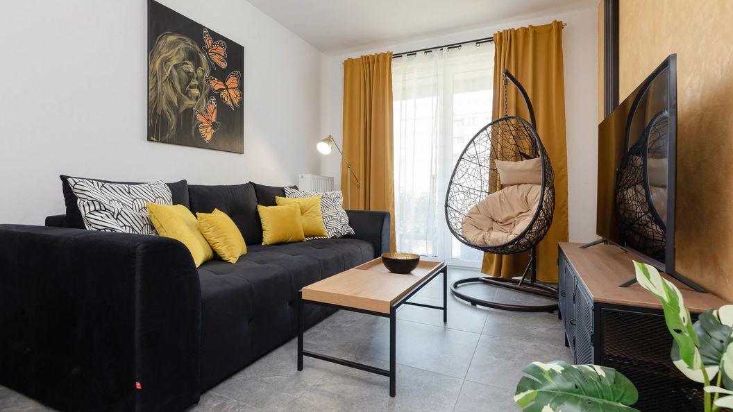 Powierzchnia 41 m² apartamentu składa się z salonu z podwójną rozkładaną sofą, aneksu kuchennego, sypialni z podwójnym łóżkiem oraz łazienki z prysznicem. Salon ma również wyjście do ogrodu, gdzie znajdziemy meble ogrodowe, idealne na poranną filiżankę kawy z widokiem na okolicę. Elegancki kontrastowy wystrój wnętrza, uzupełniony nowoczesnymi meblami tworzy prawdziwie kurortową atmosferę. Kompleksowe wyposażenie w niezbędne urządzenia kuchenne i łazienkowe (m.in. pralka, zmywarka, sprzęt do prasowania) gwarantuje komfortowy pobyt. Wieczorną rozrywkę zapewnią multimedia, takie jak telewizor z płaskim ekranem i bezpłatny dostęp do sieci Wi-Fi. Dla bezpieczeństwa naszych gości apartament wyposażony jest w czujnik tlenku węgla i dymu. Goście podróżujący samochodem mogą zaparkować na prywatnym miejscu postojowym w garażu podziemnym. Jacuzzi dostepne w sezonie wiosenno-letnim, przy dobrej pogodzie, gdy nie jest zimno.