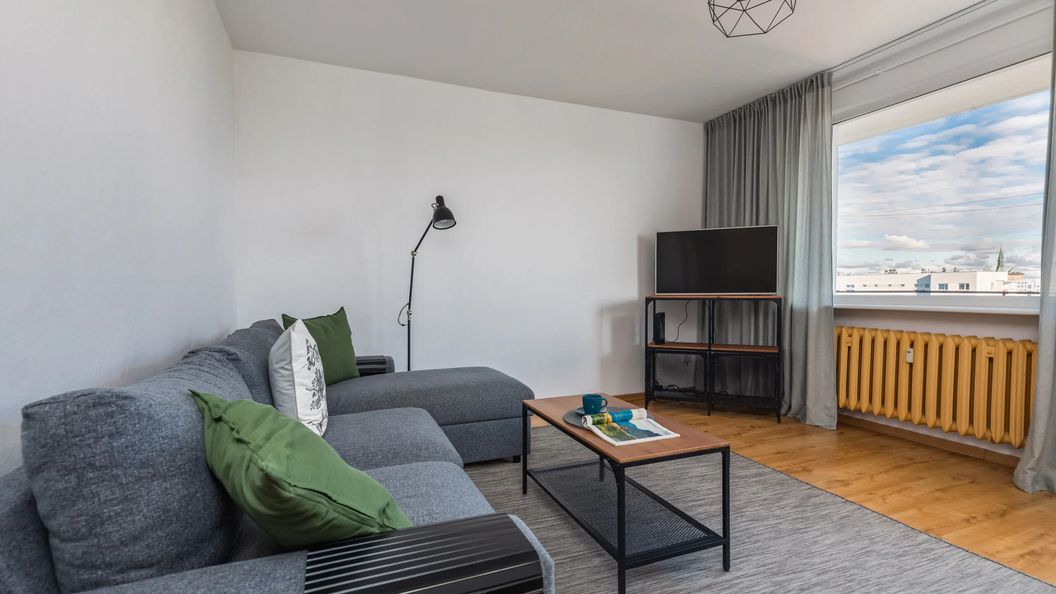 Ten w pełni wyposażony apartament z 2 sypialniami może pomieścić 6 osób. Powierzchnia 64 m² podzielona jest na przedpokój, salon z wyjściem na balkon, kuchnię, dwie sypialnie oraz łazienkę z prysznicem i osobną toaletę. Mieszkanie zachwyca przestronnością, a jasne wnętrza pozwalają się zrelaksować i odpocząć. Z balkonu i okien apartamentu roztacza się niezwykły widok na morze, port, rzekę Parsętę i stadion oraz okoliczne budynki. Funkcjonalność dorównuje również estetyce, a wygodne meble i kompleksowe wyposażenie kuchni, łazienki oraz multimediów zapewniają komfortowy pobyt. Na dobry początek przyjemnego wypoczynku zapewniamy naszym gościom bezpłatne kosmetyki, ręczniki i pościel. Dodatkowo, podróżujący z dziećmi rodzice mogą znaleźć na wyposażeniu mieszkania łóżeczko oraz krzesełko dla swojej pociechy. Do dyspozycji Gości jest również bezpłatne Wifi i telewizja.