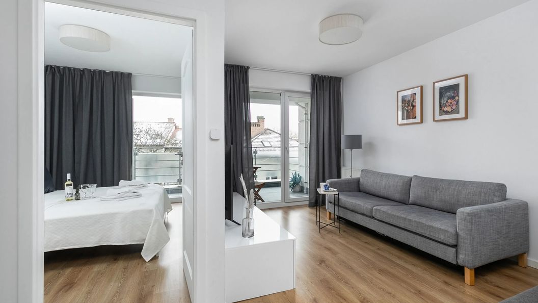Na przytulną przestrzeń składa się salon z aneksem kuchennym, sypialnia oraz łazienka z prysznicem i toaletą. Część mieszkalna, wyposażona w wygodną sofę z funkcją spania dla dwóch osób, szezlong (może posłużyć jako dostawka dla dziecka) i telewizor to idealne miejsce na odpoczynek i relaks. Goście mogą korzystać z szybkiego bezpłatnego łącza Wifi. Dodatkowo, do salonu przynależy prywatny balkon, gdzie można cieszyć się łykiem porannej, aromatycznej kawy. Aneks kuchenny wyposażony jest w wysokiej jakości sprzęt AGD, który pozwala na przygotowanie ulubionych posiłków. Unikalny wystrój i kompleksowe wyposażenie w niezbędne akcesoria kuchenne (płyta indukcyjna, ekspres do kawy) i łazienkowe (suszarka do włosów, pralka) gwarantują komfortowy pobyt. Dla ułatwienia rozpoczęcia każdego pobytu zapewniony jest bezpłatny zestaw kosmetyków (mydło, szampon i żel pod prysznic), ręczniki oraz pościel. Obiekt wyposażony jest we wszystko, co potrzebne do odpoczynku. Funkcjonalna, gustownie urządzona przestrzeń w bieli, sprawia, iż apartament jest elegancki i panuje w nim wyjątkowy, spokojny klimat.