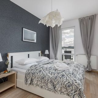 Łóżko małżeńskie, 2 stoliki nocne z lamkami, TV, wyjście na balkon, duża szafa