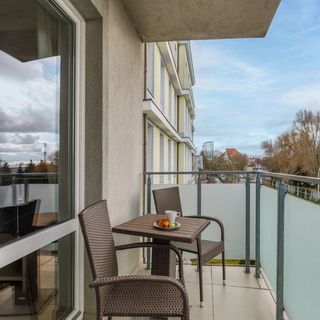 Ten komfortowy apartament ma możliwość zakwaterowania 4 osób i mieści się na 2 piętrze budynku (z windą). Przestrzeń składa się z salonu z aneksem kuchennym, z którego jest wyjście na balkon, sypialni oraz łazienki z prysznicem. Dzięki bogatemu wyposażeniu w sprzęty kuchenne takie jak piekarnik, mikrofalówka czy ekspres do kawy apartament będzie świetnym wyborem nawet na długie wakacyjne pobyty! Niewątpliwym atutem jest balkon z meblami ogrodowymi, który pozwoli zjeść śniadanie o poranku i nabrać energii na nowy dzień. Sypialnia posiada duże, wygodne łóżko małżeńskie, które pozwoli w pełni wypocząć. Łazienka została wyposażona w przestronną kabinę prysznicową i pralkę, która dodatkowo podnosi komfort pobytu. Na dobry początek pobytu zapewniamy gościom bezpłatny zestaw kosmetyków, ręczniki oraz pościel.