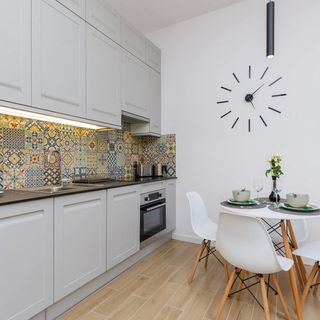 Stół z 4 krzesłami, czajnik elektryczny, toster, zmywarka, płyta indukcyjna, lodówka z zamrażarką, szklanki, zestaw garnków, sztućców, patelnia