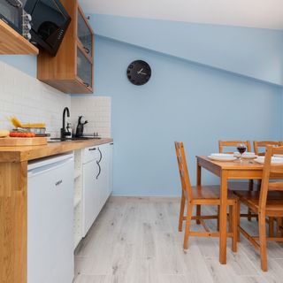 lodówka z zamrażarką, piekarnik elektryczny, czajnik elektryczny, ekspres do kawy (na kapsułki), toster, naczynia kuchenne i stołowe