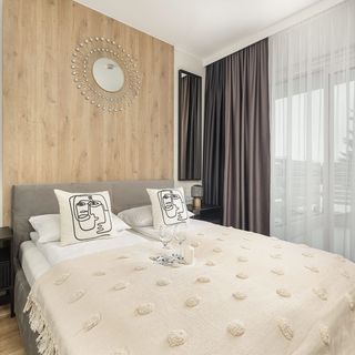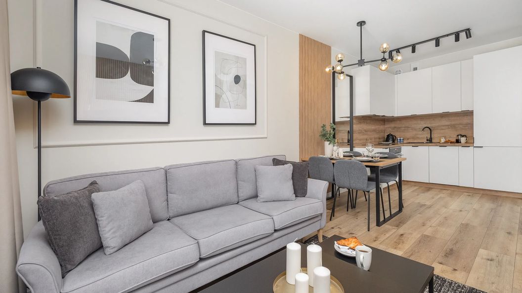 Ten przytulny, a jednocześnie elegancko urządzony apartament jest przeznaczony dla czterech osób. Został on zaaranżowany z wykorzystaniem stylowych oraz subtelnych odcieni beżu i szarości, dzięki czemu wnętrze prezentuje się nowocześnie i gustownie. Funkcjonalne wyposażenie sprawia, że przestrzeń jest komfortowa w użytkowaniu. W salonie znajduje się telewizor oraz rozkładana sofa dwuosobowa i dwa stoliki, przy których można usiąść, aby wypić poranną kawę w przyjaznej atmosferze. W pomieszczeniu dostępny jest też stół jadalniany z krzesłami idealny do serwowania i spożywania posiłków. Praktycznie zaplanowany aneks kuchenny pozwala na wygodne przyrządzanie drobnych przekąsek oraz różnego rodzaju dań. Goście mogą korzystać tutaj między innymi z piekarnika, czajnika i płyty indukcyjnej. W łazience umieszczono nowoczesny, bezprogowy prysznic, a także zestaw kosmetyków i ręczniki. W sypialni zlokalizowany jest telewizor, pojemna szafa i dwuosobowe łóżko. Apartament jest wyposażony również w duży taras, na który warto wyjść, gdy chce się na moment oderwać od swoich aktywności i odpocząć na powietrzu. Do dyspozycji odwiedzających jest miejsce postojowe w hali garażowej.