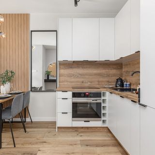 Szafki, piekarnik, zestaw sztućców i naczyń, pochłaniacz pary, płyta indukcyjna, kubki, szklanki, kieliszki do wina, lodówka z zamrażarką, patelnia, garnki, czajnik, zmywarka