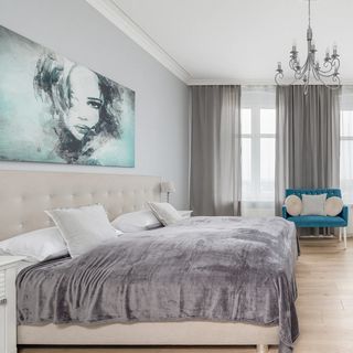 Dwuosobowe łóżko, komplet pościeli, biurko, krzesło, sofa, dwa lustra, szafa, odkurzacz, żelazko, szafki, stojąca suszarka do ubrań, deska do prasowania, stojący klimatyzator