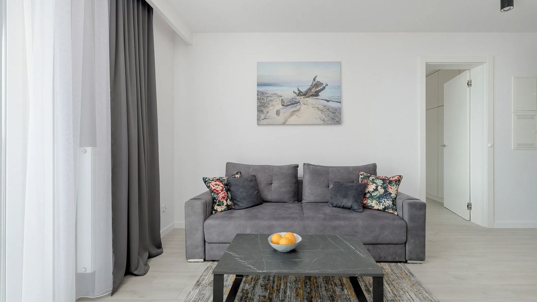 Ten malowniczo położony apartament o powierzchni 38 m² komfortowo ugości 4 osoby. Mieszkanie urzeka swoim nowoczesnym wystrojem, który jest połączeniem bieli i szarości, tworząc harmonijną atmosferę pełną elegancji i spokoju. Dodatki, takie jak obrazy przedstawiające nadmorski krajobraz, nadają przestrzeni dawkę świeżości i lekkości. Rozkład pomieszczeń obejmuje sypialnię, aneks kuchenny, salon z wyjściem na balkon oraz łazienkę z prysznicem. Przestrzeń dzienną tworzy otwarta kuchnia połączona z jadalnią i salonem. Jest to doskonała strefa relaksu, któremu sprzyja naturalne światło słoneczne wpadające przez panoramiczne okna. Dodatkowo dzięki rozkładanej, wygodnej sofie, jest to komfortowe miejsce spania dla dwóch osób. Balkon z meblami ogrodowymi dodaje uroku oraz pozwala cieszyć się poranną kawą na świeżym powietrzu. W pełni wyposażony w wysokiej jakości sprzęty aneks kuchenny sprawi, że gotowanie w takim miejscu stanie się prawdziwą przyjemnością, a domowe posiłki będą jeszcze bardziej satysfakcjonujące. Komfortowa, przestronna sypialnia z wygodnym, podwójnym łóżkiem wyposażona jest w dużą szafę, idealną do przechowywania ubrań i bagażu. Wieczorną rozrywkę zapewniają multimedia, takie jak telewizor z płaskim ekranem, a także bezpłatny dostęp do sieci Wi-Fi. Na dobry początek pobytu zapewniamy gościom bezpłatny zestaw kosmetyków, ręczniki oraz pościel. Dodatkowym atutem mieszkania jest pralka, która zwiększy komfort podczas dłuższych pobytów. Dla zamortyzowanych niewątpliwym plusem jest zagwarantowane miejsce parkingowe dostępne obok budynku. Apartament jest przyjazny zwierzętom.