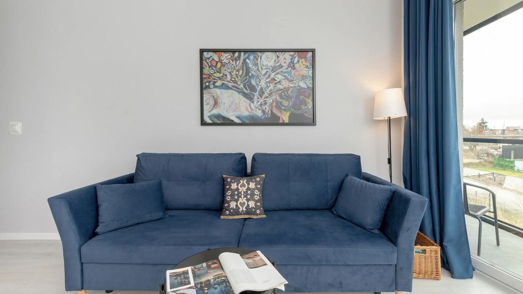 Ten gustownie urządzony apartament może gościć do 6 osób. Jest idealny dla rodziny lub grupy przyjaciół. Składa się z salonu z aneksem kuchennym, balkonu, 2 sypialni oraz łazienki z prysznicem. Wszystkie elementy mieszkania współgrają ze sobą, tworząc estetyczną dla oka całość. W apartamencie dostępny jest telewizor z telewizją kablową oraz bezpłatne łącze WiFi. Inne udogodnienia to m.in.: zmywarka, mikrofalówka czy też piekarnik, które pozwalają na komfortowy wypoczynek i poczucie się jak w domu. Na dobry początek pobytu zapewniamy gościom bezpłatny zestaw kosmetyków, ręczniki oraz pościel. Gościom podróżującym z dziećmi na życzenie możemy zaoferować łóżeczko dziecięce (obowiązuje dodatkowa opłata). Apartament posiada także miejsce parkingowe w garażu podziemnym.