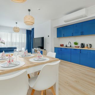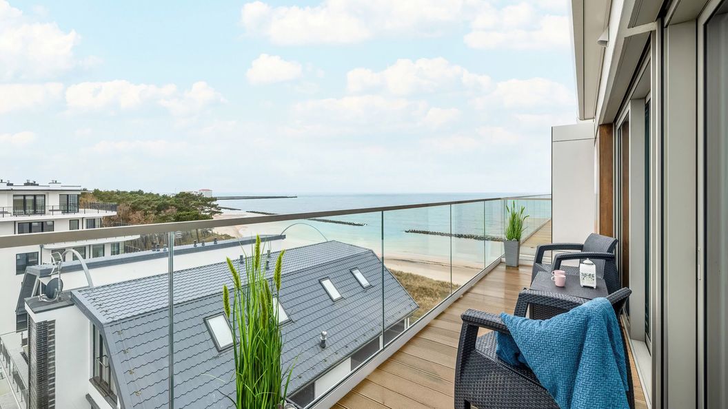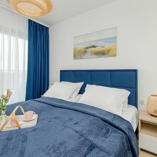 Ten stylowy i nowoczesny apartament jest przeznaczony dla czterech osób. Ma on do zaoferowania odwiedzającym wspaniały widok na morze, który można oglądać z umeblowanego balkonu. Jest to doskonała lokalizacja dla uczestników wyjazdów biznesowych oraz wypoczynkowych. Na dostępnym z salonu oraz sypialni balkonie ustawiono meble ogrodowe, dzięki czemu odwiedzający mogą spożywać posiłki i przekąski na powietrzu. To wspaniałe miejsce dla osób, które chcą wypić poranną kawę w przyjaznej atmosferze. W salonie znajduje się rozkładany narożnik dwuosobowy w ciemnoniebieskim kolorze. Dostępny jest tutaj też duży telewizor z dostępem do kanałów naziemnych, stolik i jadalniany stół z krzesłami. O możliwość komfortowego przygotowywania posiłków dba funkcjonalnie wyposażony aneks kuchenny - mieści się w nim między innymi kapsułkowy ekspres do kawy, czajnik i pralka. W sypialni stoi pojemna szafa i wygodne łóżko dwuosobowe, a także biurko, które pozwala na wygodną pracę zdalną. Łazienka może zaoferować prysznic, powitalny zestaw kosmetyków i suszarkę do włosów. Zwierzęta są tutaj akceptowane za dodatkową opłatą.