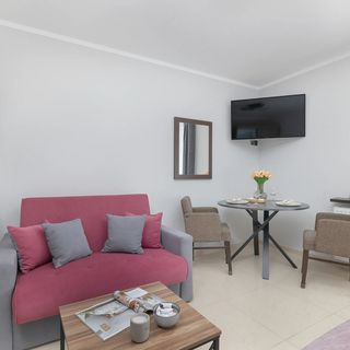 Sofa, łóżko małżeńskie, TV, stół z krzesłami