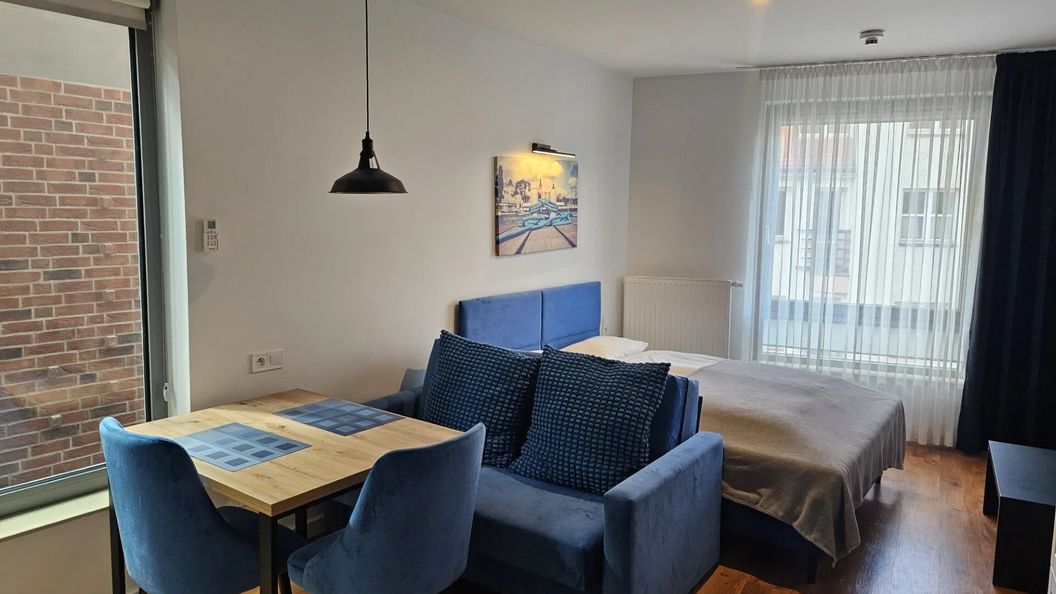 Elegancki apartament typu studio posiada powierzchnię 29 m² i z przyjemnością ugości 3 osoby. Jego wyjątkowy wystrój został zaprojektowany w jasnych kolorach, z dużą ilością drewnianych elementów i granatowymi dodatkami. Przestrzeń apartamentu składa się z salonu, aneksu kuchennego oraz łazienki z prysznicem. W salonie znajduje się wygodna rozkładana sofa, która w nocy zamienia się w miejsce do spania dla 2 osób oraz łóżko małżeńskie. Nowoczesny telewizor z funkcją SmartTV oraz dostęp do Internetu pozwolą na relaks przy ulubionych filmach i serialach. W salonie znajduje się także stół z krzesłami, przy którym można wygodnie spożywać wspólne posiłki. Aneks kuchenny posiada wszystkie udogodnienia oraz przybory, niezbędne do przygotowywania posiłków. Znajduje się w nim kuchenka mikrofalowa, zmywarka, ekspres do kawy oraz lodówka z zamrażarką. W nowoczesnej łazience dostępna jest pralka, co będzie niewątpliwym atutem podczas dłuższych pobytów. Jest tu także suszarka do włosów, zestaw kosmetyków oraz ręczniki dla naszych Gości. Apartament z przyjemnością ugości również Państwa zwierzęta domowe. Posiada on także klimatyzację, która będzie dużą zaletą podczas ciepłych, letnich dni.