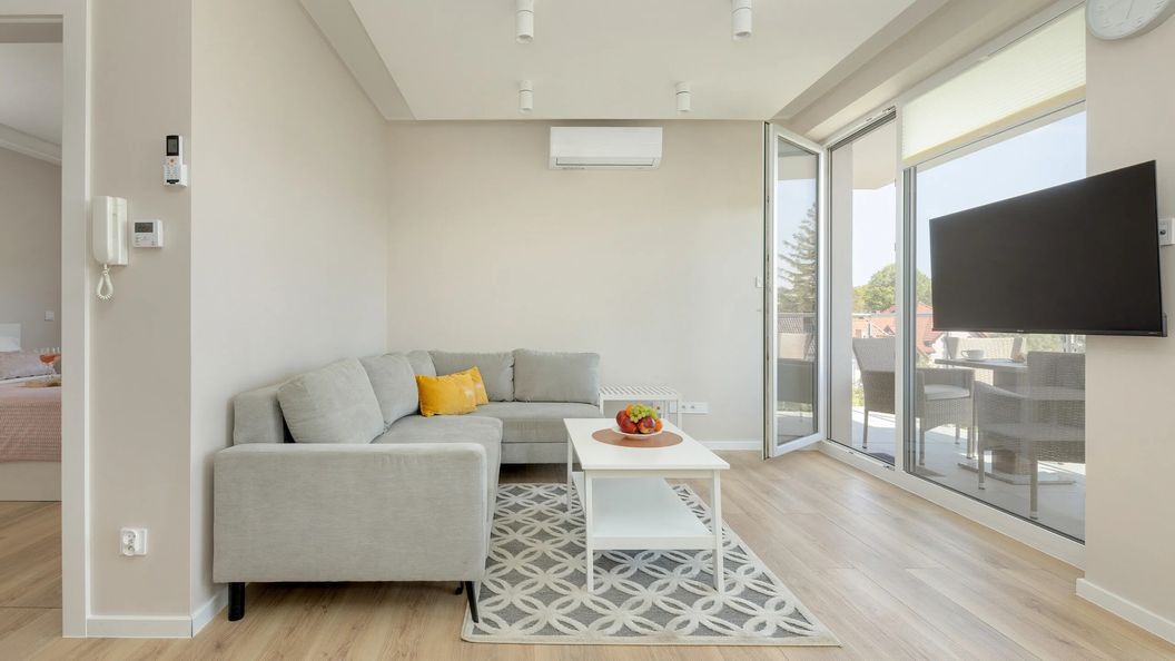 Oferta obejmuje klimatyzowany apartament dla 4 osób, który składa się z salonu z aneksem kuchennym, oddzielnej sypialni oraz łazienki z prysznicem. W części dziennej znajduje się rozkładana sofa, a w sypialni łóżko małżeńskie. Do lokalu przynależy balkon z meblami ogrodowymi. Aneks kuchenny jest w pełni wyposażony i obejmuje m.in. płytę indukcyjną, zmywarkę, lodówkę, kuchenkę mikrofalową, toster oraz przelewowy ekspres do kawy.