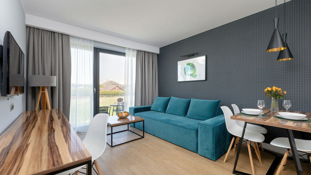 Elegancki apartament dla czterech osób znajduje się na pierwszym piętrze i wyróżnia się jasnym, nowoczesnym wystrojem. Dwa miejsca noclegowe znajdują się w sypialni z podwójnym łóżkiem typu king-size, a kolejne dwa w salonie na podwójnej rozkładanej sofie. Aneks kuchenny wyposażono w płytę indukcyjną, piekarnik, kuchenkę mikrofalową oraz zmywarkę, co umożliwia komfortowe przygotowywanie posiłków. Umeblowany balkon pozwala na relaks na świeżym powietrzu - to idealne miejsce na śniadanie lub łyk porannej kawy. Łazienka, urządzona z dbałością o każdy detal, wyposażona jest w przestronny prysznic typu walk-in, który zapewnia doskonałe warunki do odprężenia po całym dniu. Dodatkowo wysoka jakość wykończenia łazienki podkreśla jej elegancki charakter. Możliwość pracy zdalnej zapewnia biurko umiejscowione w salonie oraz dostęp do szybkiej sieci WiFi. Inne udogodnienie multimedialne stanowi telewizor z płaskim ekranem i dostępem do telewizji naziemnej. Apartament to doskonała opcja na pobyt nad morzem. Do apartamentu nie jest przypisane żadne konkretne miejsce parkingowe, ale gwarantuje on dostęp do prywatnego parkingu.
