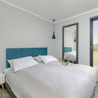 Łóżko podwójne typu king-size, szafki, lampki,