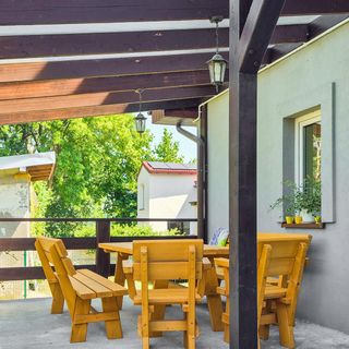 - Dom wykonany z drewna i cegły