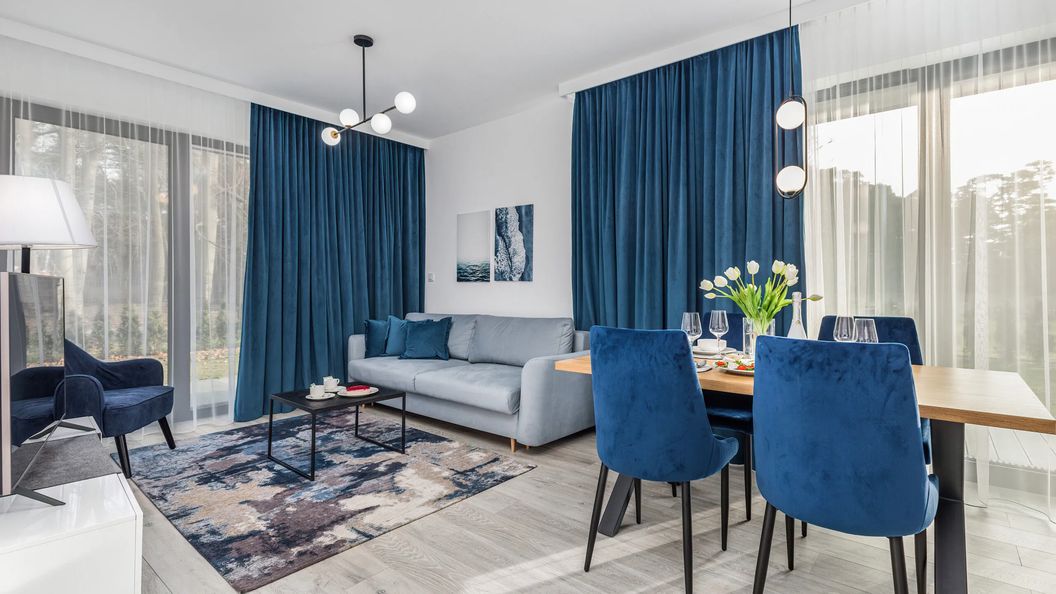 Przestrzeń apartamentu składa się z przestronnego salonu połączonego z aneksem kuchennym, dwóch oddzielnych sypialni oraz dwóch łazienek – jednej wyposażonej w prysznic, a drugiej w wannę, co zapewnia maksymalny komfort nawet większej grupie. Salon oferuje wszystko, co potrzebne do relaksu oraz wakacyjnego wypoczynku.