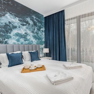 Łóżko podwójne, pościel, stolik nocny, szafa, wyjście na taras