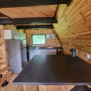 W domku nr 1 na parterze jest taras, salon z dobrze wyposażoną kuchnią (zmywarka, płyta indukcyjna, piekarnik, lodówka). W domku znajduje się narożnik z miejsce do spania dla dwóch osób dorosłych lub troje dzieci, stolik kawowy, stół, 4 krzesła, wyspa kuchenna z dwoma hokerami i łazienka z prysznicem, suszarka do włosów, parownica do ubrań.