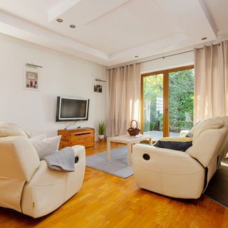 Sofa, fotele, TV, stolik kawowy, wyjście na taras