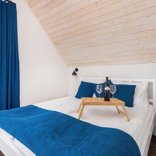 Łóżko podwójne, toaletka z lustrem i krzesłem, pościel, stoliki nocne, szafa