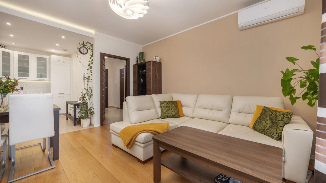 Rozkładana kanapa, TV, stolik kawowy, stół jadalniany z 4 krzesłami, szafa, wyjście na balkon