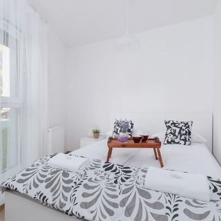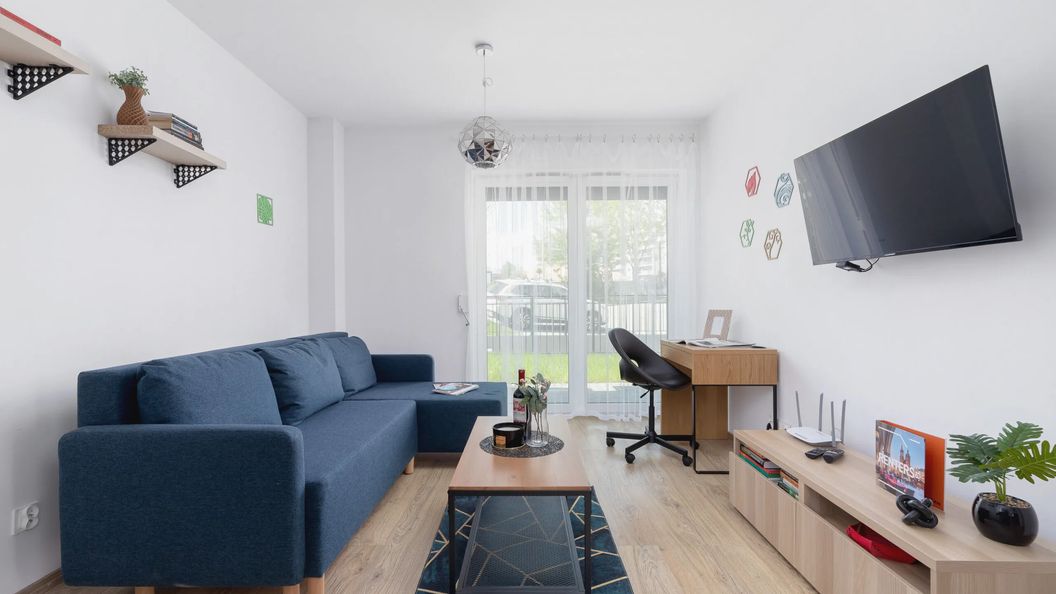 Przestronny, słoneczny apartament oferuje możliwość zakwaterowania 6 osób. Doskonałe miejsce noclegowe na wypad do Krakowa z rodziną lub grupką przyjaciół. W skład przestrzeni mieszkalnej wchodzi salon z aneksem kuchennym, dwie sypialnie – jedna sypialnia z łóżkiem małżeńskim, a druga z wygodną kanapą oraz łazienka z prysznicem. Dodatkowo, część dzienna posiada wyjście na przynależący do mieszkania taras. Apartament został zaaranżowany w sposób bardzo funkcjonalny, a jednocześnie niezwykle cieszący oko. W salonie, jak i w jednej z sypialni umieszczono biurko z wygodnym krzesłem, dzięki czemu mieszkanie przystosowane jest do pracy zdalnej i goście będą mogli w komfortowy sposób wypełnić służbowe obowiązki. To jasne i przyjemne mieszkanie oferuje stylowe umeblowanie oraz kompleksowe wyposażenie w niezbędne akcesoria kuchenne oraz łazienkowe. Goście mogą korzystać z takich udogodnień jak telewizor ze SmartTV, bezprzewodowe łącze Wi-Fi oraz bezpłatny zestaw kosmetyków, ręczników i pościeli. Do mieszkania przynależy również miejsce parkingowe. Goście podróżujący z pupilami są mile widziani w tym apartamencie – zwierzęta są dozwolone za dodatkową opłatą.