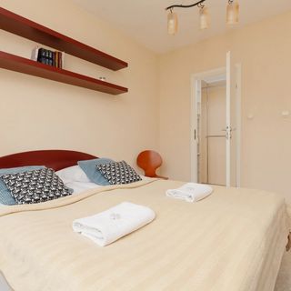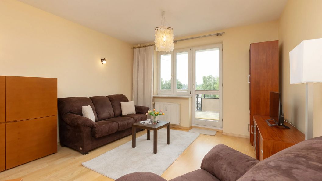Ten przestronny apartament przy ul. Działkowej w Pruszkowie gwarantuje miejsce noclegowe dla 4 osób. Powierzchnia mieszkalna składa się z przestronnego salonu z aneksem kuchennym, sypialni z łóżkiem małżeńskim oraz łazienki z wanną, a także oddzielnej garderoby. Część dzienna posiada wyjście na balkon z widokiem na okolicę oraz sąsiadujące budynki. Dzięki meblom ogrodowym można swobodnie usiąść na balkonie i delektować się pyszną kawą o poranku. Elegancki wystrój, gustowne umeblowanie oraz kompleksowe wyposażenie w niezbędne akcesoria kuchenne (kuchenka mikrofalowa, czajnik) oraz łazienkowe (pralka, suszarka do włosów) zagwarantują gościom najwyższy komfort pobytu. Swój wystrój mieszkanie zawdzięcza również ciepłej palecie barw oraz ciekawym dodatkom takim jak fantazyjne lampy. Do dyspozycji podróżnych zapewniono udogodnienia multimedialne – telewizor z technologią SmartTV oraz bezpłatne łącze Internetowe Wi-Fi. Dbając o dobry początek przyjemnego wypoczynku na początek każdego przyjazdu zapewniony zostaje bezpłatny zestaw kosmetyki, ręczniki i pościel.