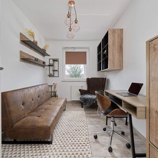 Rozkładana sofa, fotel, biurko z krzesłem, komoda