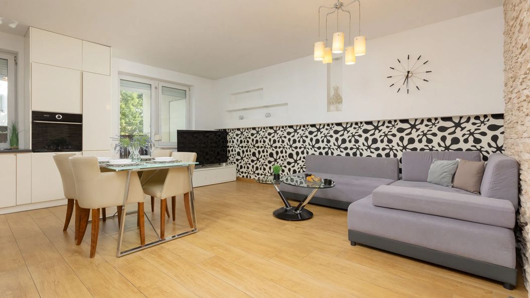 Warszawski apartament o powierzchni 68 m² gwarantuje zakwaterowanie dla 6 osób. Miejsce to jest idealną propozycją dla gości, którzy pragną rozsmakować się w niepowtarzalnej atmosferze Stolicy z rodziną i przyjaciółmi. Powierzchnia apartamentu składa się z salonu z wygodną sofą z narożnikową, doskonale wyposażonego aneksu kuchennego, dwóch sypialni, łazienki z wanną i funkcją prysznica oraz dodatkowej toalety. Spójna paleta barw w modnych odcieniach oraz nowoczesne umeblowanie nadają całości ciekawego klimatu. Ten przestronny i elegancki azyl zagwarantuje gościom pełną satysfakcję oraz udany pobyt wypoczynkowy. Na komfort Gości niewątpliwie wpłyną również udogodnienia multimedialne takiej jak bezpłatne łącze WiFi, telewizor z kanałami kablowymi oraz niezbędne sprzęty kuchenne (zmywarka, piekarnik) i łazienkowe (pralka). W apartamencie znajduje się biurko umożliwiające pracę zdalną, dzięki czemu goście mogą zadbać o wypełnienie służbowych obowiązków. Do mieszkania przynależą również dwa balkony, które są świetnymi miejscami do popołudniowego relaksu z widokiem na okolicę. Na dobry początek zakwaterowania zapewniono gościom bezpłatny zestaw kosmetyków, ręczniki oraz pościel. Apartament ma zapewnione prywatne miejsce parkingowe w garażu podziemnym.