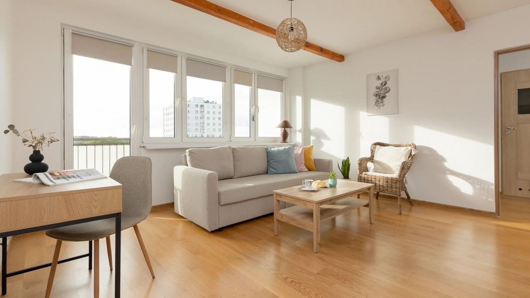 Rozkładana kanapa, komplet pościeli, TV, stolik kawowy, biurko, fotel, wyjście na balkon