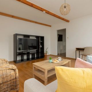 Apartament wykończony w eleganckim stylu może pomieścić 6 osób na powierzchni 65 m2. Wnętrze składa się z salonu, w którym znajduje się podwójna rozkładana sofa, oddzielnej kuchni, dwóch sypialni z podwójnym łóżkiem oraz łazienki z wanną oraz osobnej toalety. Z salonu jest wyjście na balkon, gdzie można usiąść na wygodnych fotelach i pozwolić sobie na chwilę wytchnienia rozkoszując się filiżanką kawy. W kuchni znajdują się wszystkie niezbędne sprzęty kuchenne, dzięki którym goście mają możliwość przygotowania smacznych, domowych posiłków. Przestrzeń obiektu jest funkcjonalnie zaprojektowana, wychodząc naprzeciw wszelkim potrzebom gości. Udogodnienia obejmują wyposażenie multimedialne (telewizor z płaskim ekranem oraz bezpłatne łącze internetowe Wi-Fi). Ponadto w apartamencie dostępne jest żelazko, deska do prasowania i pralka. W łazience znajduje się bezpłatny zestaw kosmetyków, ręczniki i suszarka do włosów. W mieszkaniu znajduje się także biurko, przy którym osoby pracujące zdalnie mogą bez przeszkód wykonywać swoje codzienne obowiązki.